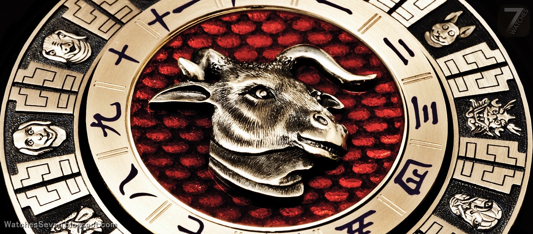 Dial: in solid gold hand-engraved – twelve different engravings represent the Chinese zodiac heads, which formed the Yuanming Yuan clepsydra. Each dial has at its center the bas-relief of a zodiac sign decorated with the Grand Feu enamel technique.