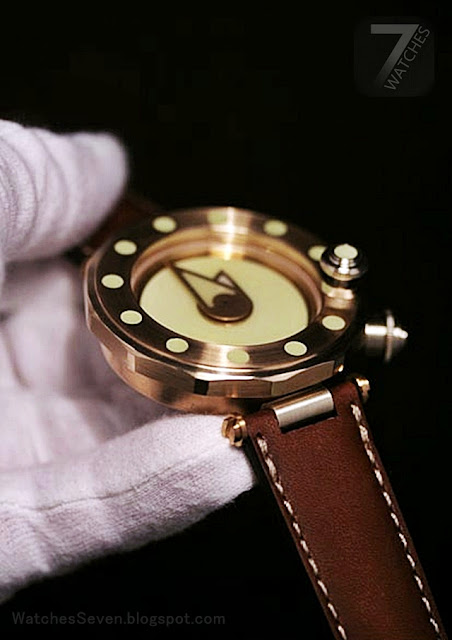 Three-body case and fittings entirely made of Aluminum-Bronze, sapphire crystal, back with sapphire crystal, revolving bezel to set diving time with 11 Email Lumineuse inlays, fixing screw and „end-of-dive-time“ marker with Email Lumineuse dot.