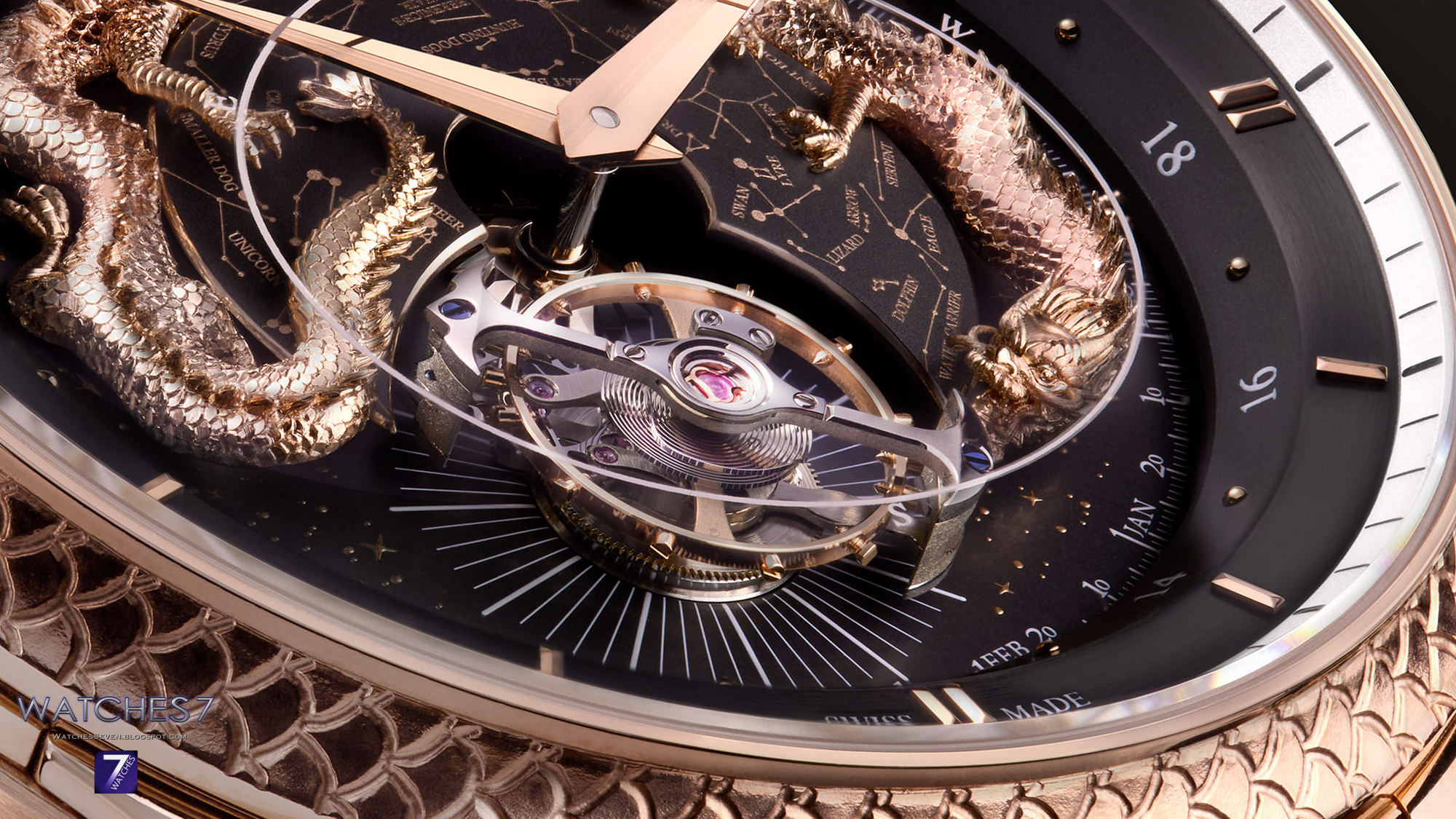 In a subtle allusion to infinite depths of the night sky, the dial is constructed on multiple levels, amplifying the beauty of the celestial displays while creating a three-dimensional habitat for a pair of magnificent, sculpted gold dragons.