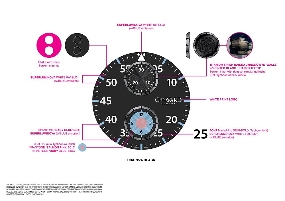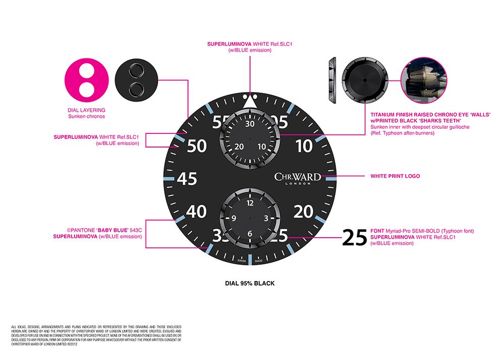 The charcoal black dial, which uses the font of the Typhoon's Head Up Display (HUD) for the SuperLuminova numerals, carries the RAF's low visibility, baby blue and salmon pink roundel at 6'O'clock, and even the outlines of the chronograph eyes have been subtly indented with the shape of the planes after-burners.